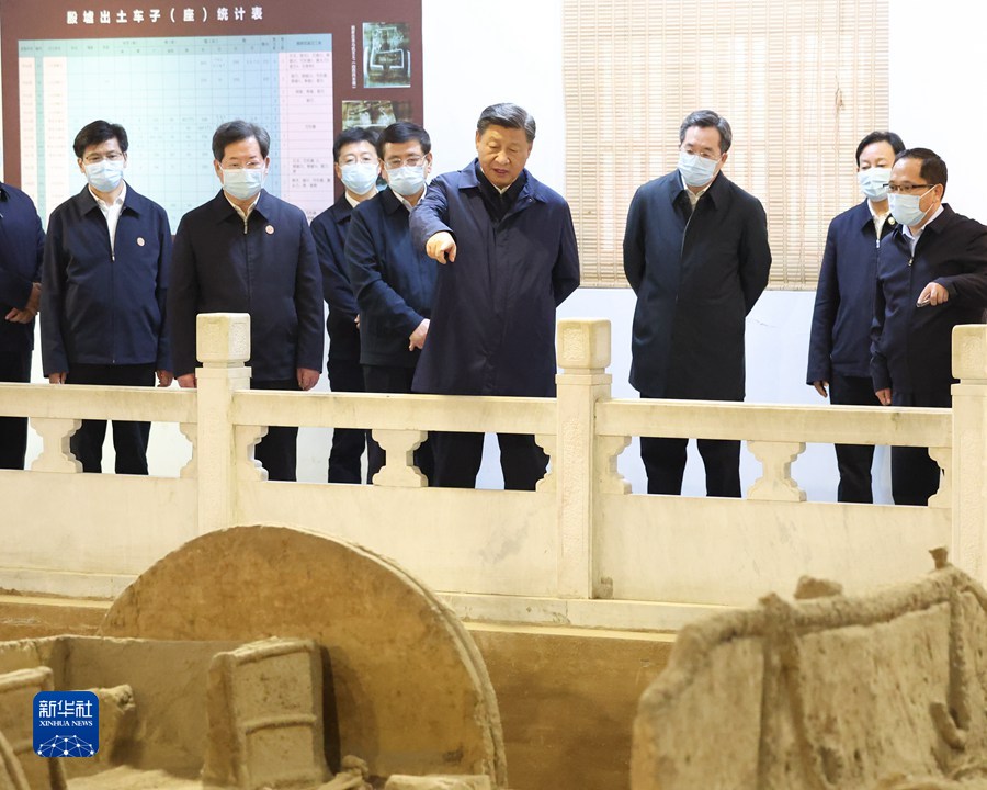 28日下午,習近平考察了位于安陽市西北郊洹河南北兩岸的殷墟遺址。殷墟是我國歷史上第一個文獻可考、為考古發(fā)掘所證實的商代晚期都城遺址。習近平步入殷墟博物館,仔細觀摩青銅器、玉器、甲骨文等出土文物。隨后,習近平來到車馬坑展廳,察看商代畜力車實物標本和道路遺跡。他指出,殷墟出土的甲骨文為我們保存3000年前的文字,把中國信史向上推進了約1000年。殷墟我向往已久,這次來是想更深地學習理解中華文明,古為今用,為更好建設中華民族現(xiàn)代文明提供借鑒。中國的漢文字非常了不起,中華民族的形成和發(fā)展離不開漢文字的維系。在這方面,考古事業(yè)居功至偉??脊殴ぷ饕^續(xù)重視和加強,繼續(xù)深化中華文明探源工程。中華文明源遠流長,從未中斷,塑造了我們偉大的民族,這個民族還會偉大下去的。要通過文物發(fā)掘、研究保護工作,更好地傳承優(yōu)秀傳統(tǒng)文化。習近平強調(diào),中華優(yōu)秀傳統(tǒng)文化是我們黨創(chuàng)新理論的“根”,我們推進馬克思主義中國化時代化的根本途徑是“兩個結(jié)合”。我們要堅定文化自信,增強做中國人的自信心和自豪感。
